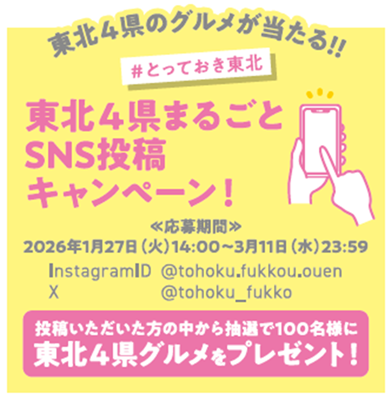 期間中、公式アカウントをフォローし、ハッシュタグ「#とっておき東北」を付けて、東北4県のグルメ・景色・産品などの写真を投稿いただいた方の中から、抽選で100名様に東北4県のグルメをプレゼントします。