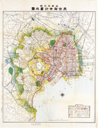 罹災世帯は東京市の73.4%、大火による市の焼失面積は約3,465haで市域面積の44%にのぼりました。帝都復興事業は街路計画、予算規模について審議された結果、計画の修正、縮小が行われました。本図は最終決定された計画案です。帝都復興事業による土地区画整理事業は、一部の強硬な反対を受けつつも国と東京市により大規模に実施され、施行面積は東京の焼失面積の約9割、およそ3,117ha余に及びました。