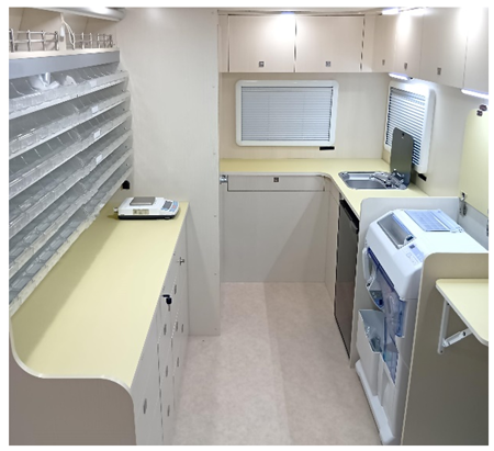 被災地での医薬品供給を担う車両で、車内に医薬品・調剤設備・給水タンク・電源等を搭載し、ライフライン途絶時も薬剤師による調剤・医薬品供給が可能となります。